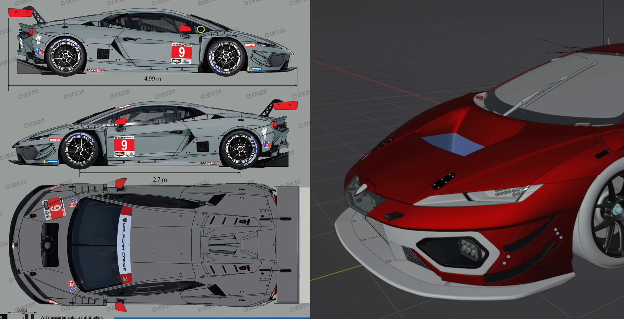 Left-to-right: Lamborghini Temerario GT3 2D Design Template, 3D Model